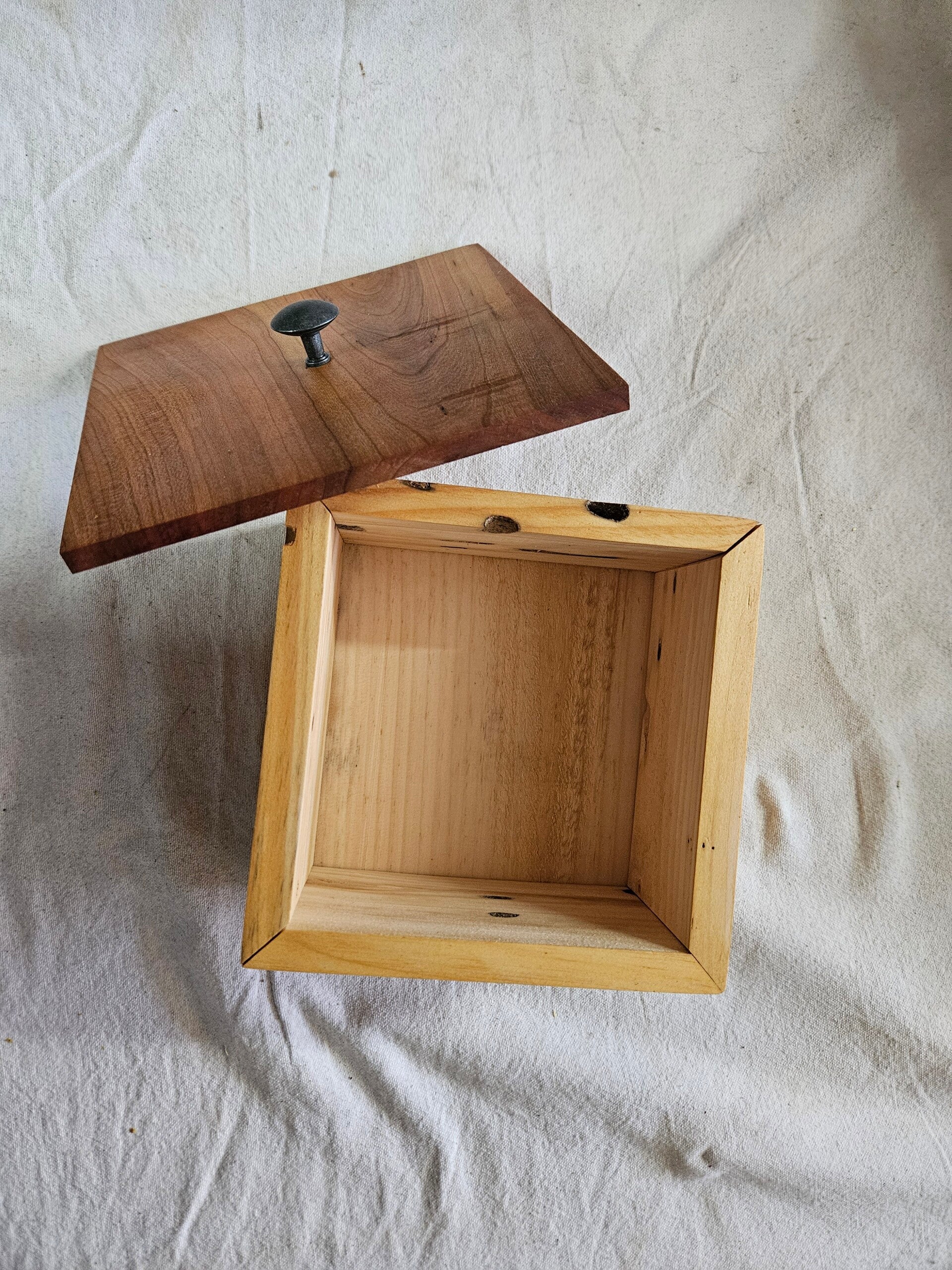 Gorgeous pine at a spectacular stage of life where bugs created unique holes. The cover was created with cherry wood and we added a metal knob. ( I use mine to store garlic )